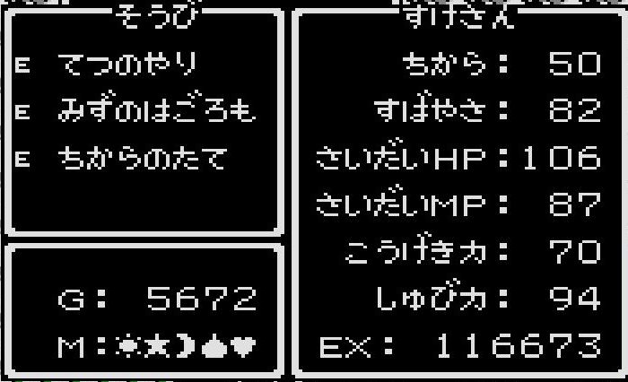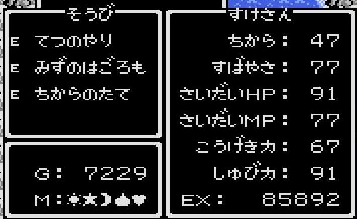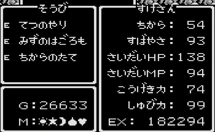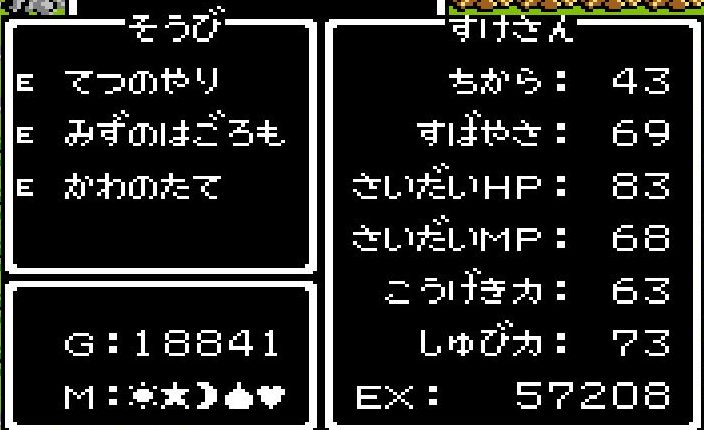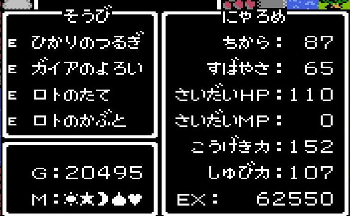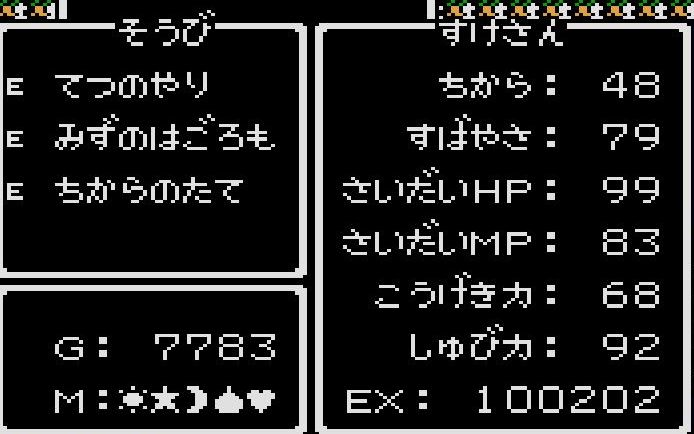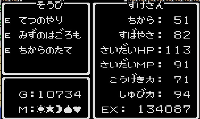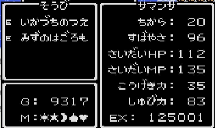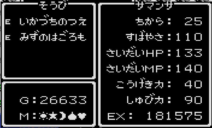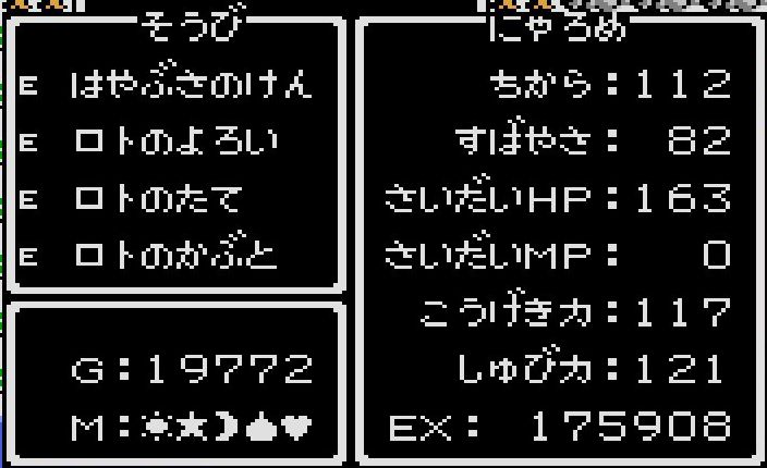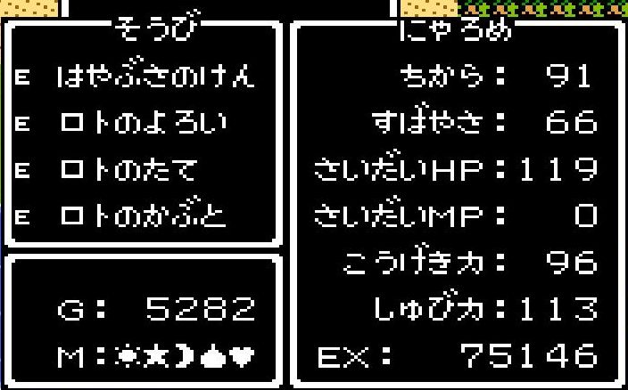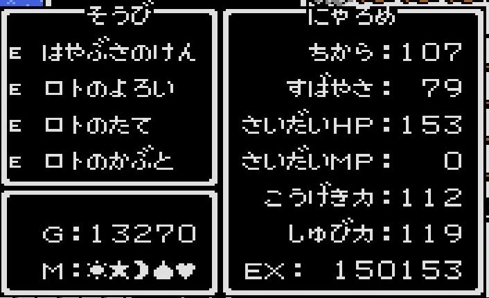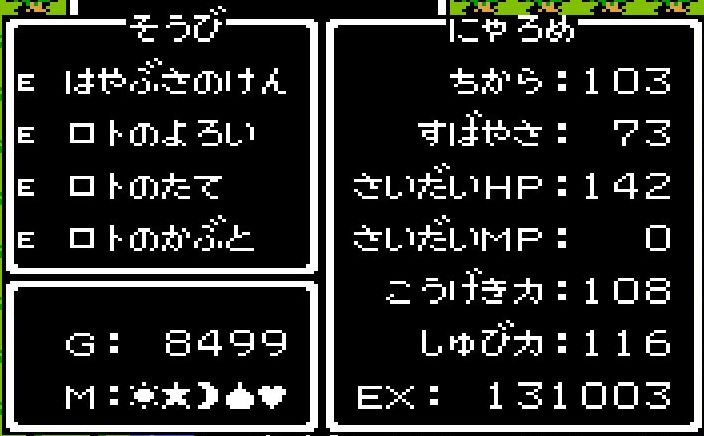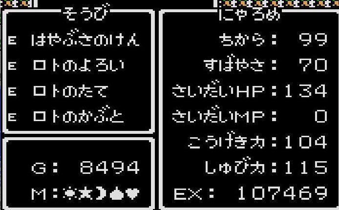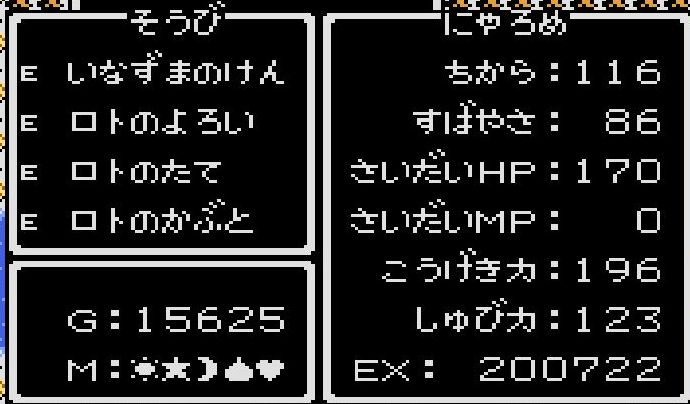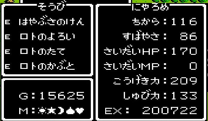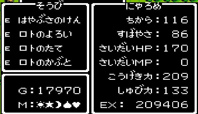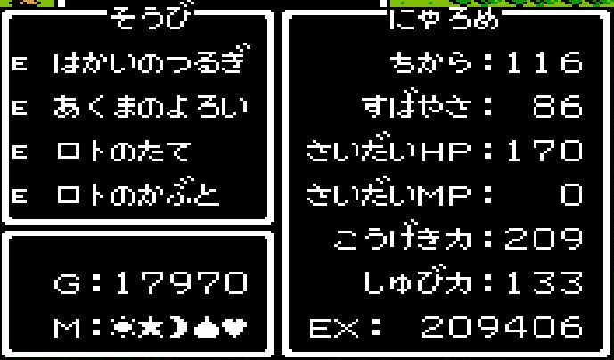そうすると、「破壊の剣」の威力を持った「はやぶさの剣」と「悪魔の鎧」の守備力のままの「ロトの鎧」になる。これは便利。レベルアップしたり、装備を変えると効力がなくなるらしい。